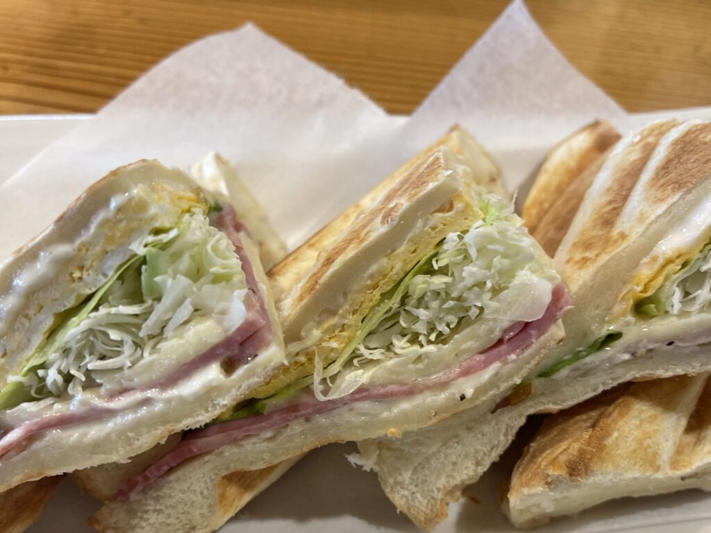 食事やスイーツが大変魅力的なさとう珈琲。名物のグリルサンドは、大きめのパンにたくさんの具!大満足の一品。シャキシャキのせんキャベツとベーコンと卵、辛子マヨネーズが具とパンを繋いでくれて美味しかった!少食さんは食べきれないくらいのボリュームです。