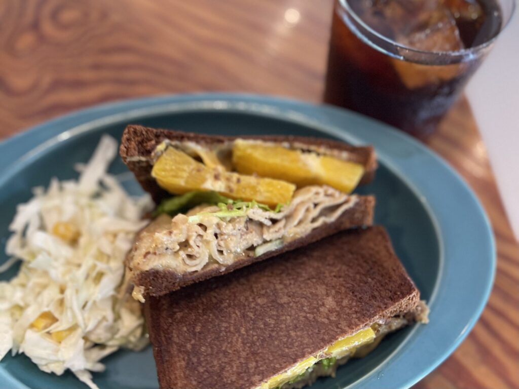ランチタイムはWNCサンドイッチとアイスコーヒーのセットで1300円。サンドイッチにしては高いなぁ…と思っていましたが、自分には思い浮かばないレシピのサンドイッチに出会えて良かったです!お肉×オレンジの組み合わせめちゃくちゃ美味しかった。