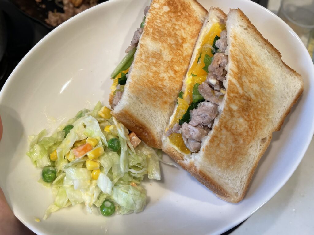具材を準備してパンに挟み、フライパンで焼くのがポイント。ホットサンドが好きな方、グルメ系バーガーが好きな方はたまらない味です。ホットサンドメーカーで焼いても◎